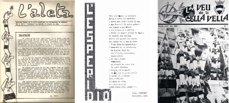 D'esquerra a dreta, els primers números de L'Aleta, dels Bordegassos de Vilanova (que fou la primera revista castellera interna d'una colla, l'any 1980); L'Esperidió, de la Colla Jove Xiquets de Tarragona (1980); i La Veu de la Colla Vella, de la Colla Vella dels Xiquets de Valls (1981)