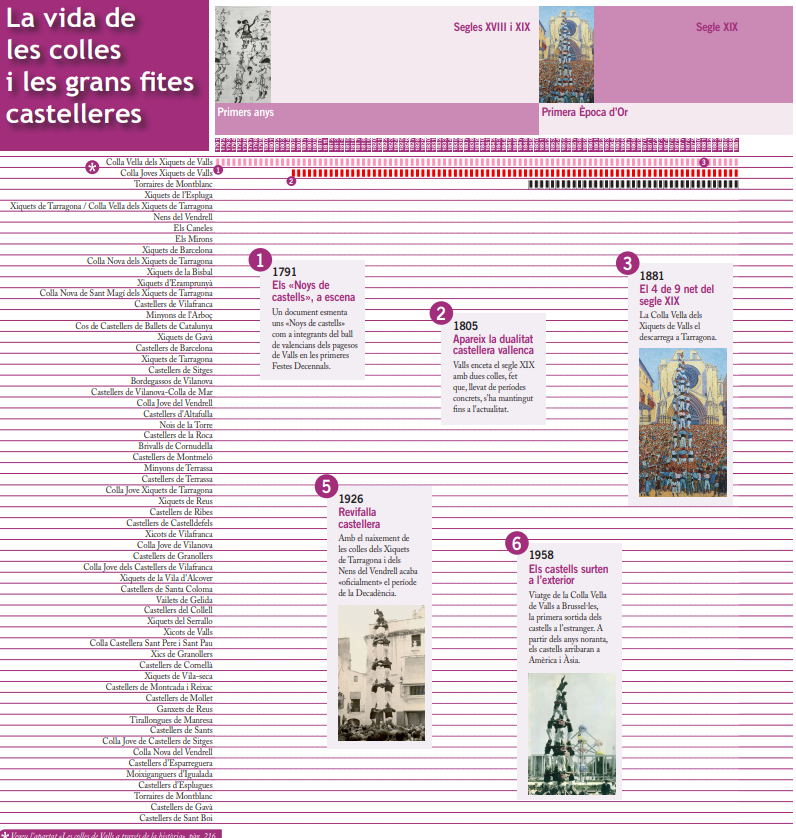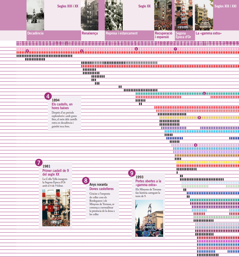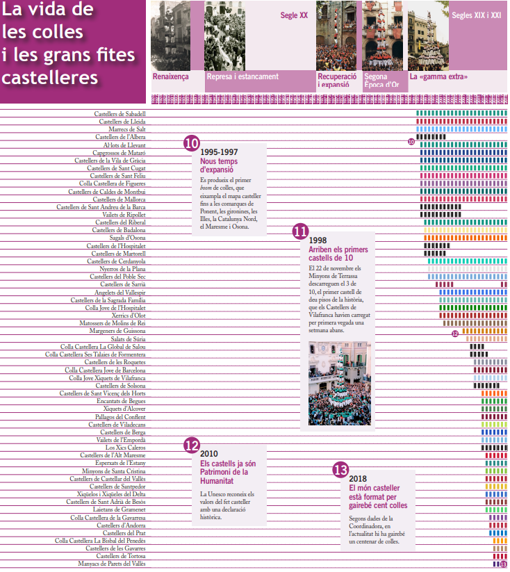 Per a cada colla castellera s’indiquen els anys d’activitat. Els requadrets negres corresponen a les colles desaparegudes (vegeu pàg. 286-292). No s’hi han inclòs les colles en formació