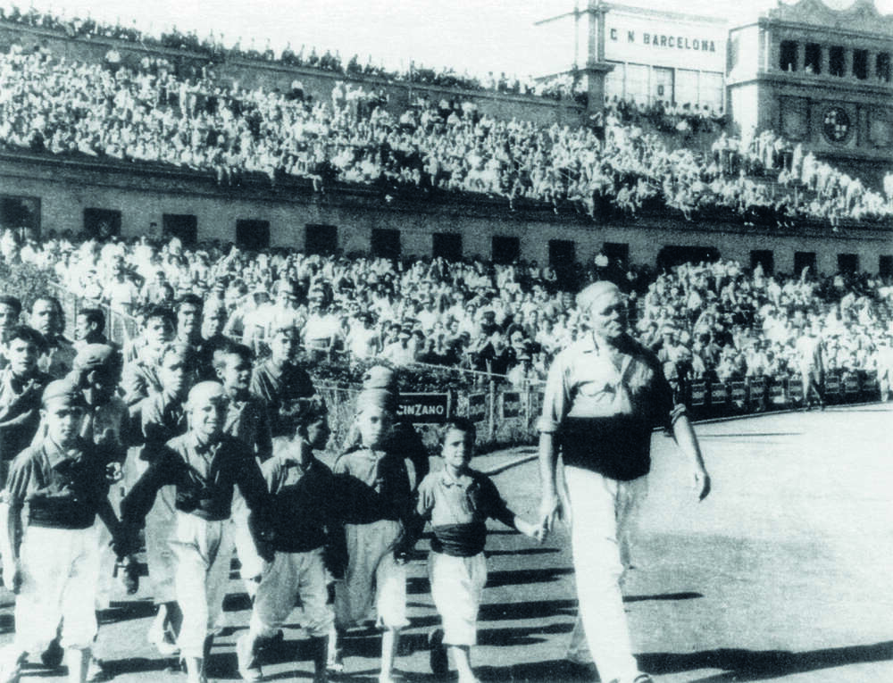 Jan Julivert, cap de colla dels Nens del Vendrell durant gairebé tres dècades, entrant a l'Estadi Olímpic de Montjuïc al capdavant de la canalla i dels castellers de la colla, l'any 1957, a l'arribada del Tour de França.