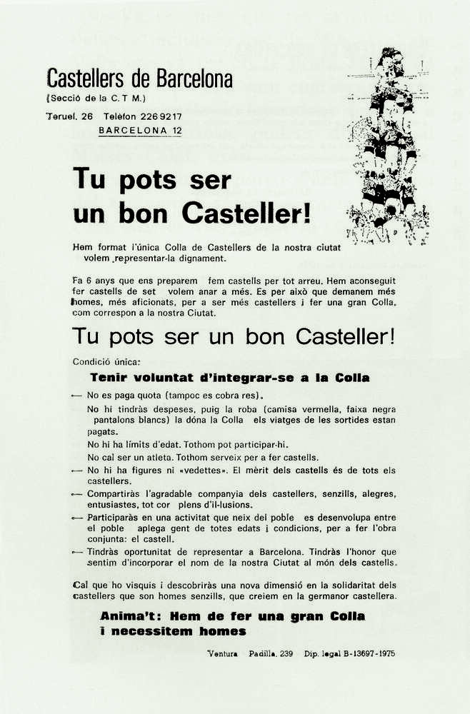 No va ser, però, l’única innovació a què els barcelonins es van veure abocats. En un àmbit en què els castells no eren gaire coneguts, i menys encara considerats com a quelcom propi —malgrat que d’actuacions castelleres a Barcelona se n’havien fet amb certa freqüència des del segle XIX i que els nuclis de Gràcia i Sants, aleshores independents de Barcelona, fins i tot havien tingut colla castellera pròpia, impulsada per elements del Camp de Tarragona traslladats al Pla de Barcelona (Güell 2017a i 2017b)—, la nova colla va haver d’esmolar les seves habilitats comunicatives i propagandístiques per donar-se a conèixer. D’aquesta manera, d’una banda afegien complexitat a l’estructura de la colla, i de l’altra contribuïen fortament a redefinir la manera com el món casteller es presentava en societat. És molt interessant, per exemple, el fullet editat per la colla el 1975 i titulat «Tu pots ser un bon casteller!» (també amb traducció al castellà),50 amb què es pretenia captar nous membres. La «condició única» per ser un bon casteller era «tenir voluntat d’integrar-se a la colla». «Tothom pot participar-hi», «No cal ser un atleta. Tothom serveix per a fer castells», «una activitat [….] que aplega gent de totes edats i condicions»… Un discurs difícilment imaginable deu anys abans i que, en canvi, resulta perfectament vigent avui dia, amb l’excepció de l’arenga final, que clarament situa el fullet en la seva època: «Hem de fer una gran colla i necessitem homes.»