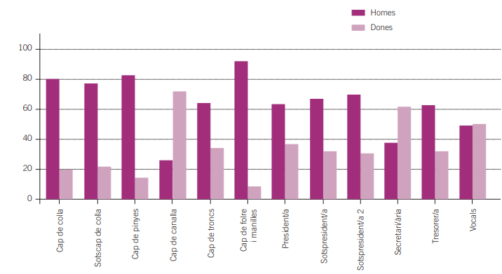 En el cas del gènere, sí que disposem de dades prou reveladores, especialment gràcies a un estudi recent del Centre de Prospectiva i Anàlisi dels Castells (Cepac) i l’Observatori per la Igualtat de la URV (Pontón et alii 2018). Actualment, les dones suposen un 40 % del col·lectiu, això sí, amb diferències importants entre colles. Així, en les agrupacions universitàries i algunes de convencionals (generalment de recent creació) poden arribar a ser majoria, mentre que les colles més tradicionals encara se situen clarament per sota de la mitjana (33 % a la Joves de Valls i 18 % a la Vella de Valls). Ara bé, aquest mateix estudi demostra que aquesta pluralitat no es reflecteix encara en l’accés als càrrecs directius: només un 35 % dels presidents i un 17 % dels caps de colla són dones. Altre cop hi ha diferències significatives entre les colles: els lideratges femenins són més habituals en les colles universitàries i fora de la zona tradicional, i en canvi són més rars com més nivell té la colla. L’estudi també reflecteix que les dones ocupen sobretot càrrecs amb funcions connotades des del punt de vista de gènere: hi ha un 72,7 % de caps de canalla dones, però només un 16,4 % de caps de pinyes; o un 61,8 % de secretàries, però només un 36,3 % de tresoreres.