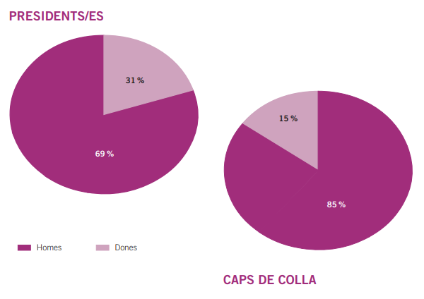 Percentatges, per gènere, de caps de colla i presidents/es de les agrupacions castelleres. Les dades corresponen a la temporada 2017