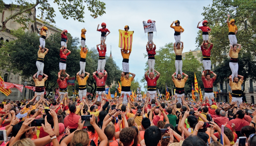 Els pilars dels Bordegassos de Vilanova i dels Nens del Vendrell dibuixen una senyera durant la manifestació independentista de l'11 de setembre del 2018.