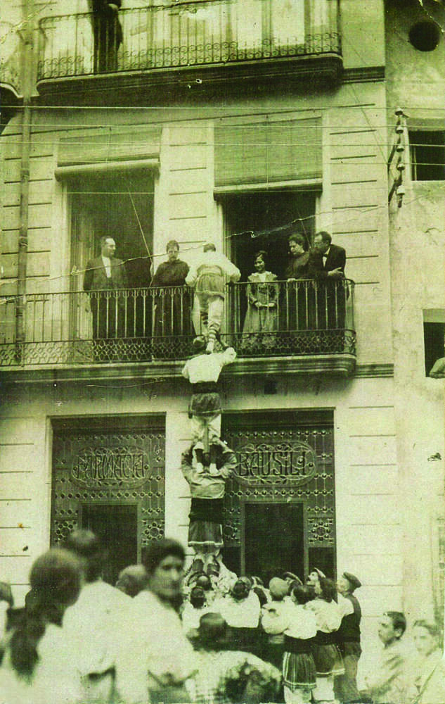 Pilar de 5 al balcó de la Colla Vella de la Moixiganga d’Igualada, al carrer del Born núm. 8, davant de la farmàcia Bausili, per la festa major d’Igualada del 1912.