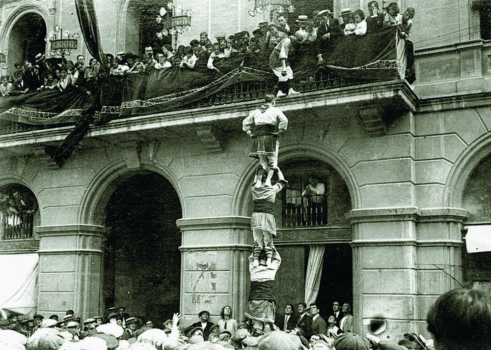 Pilar de 4 al balcó, a càrrec de la Colla Vella de la Moixiganga d’Igualada. Plaça de l’Ajuntament d’Igualada, el 24 d’agost del 1923.