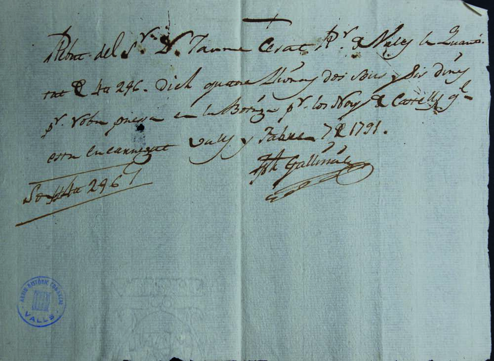 Rebut del senyor Don Jaume Cesat, rector de Valls, la quantitat de 4ll 2s 6, dich quatre lliuras dos sous y sis diners, per roba pressa en la botiga per los Noys de Castells que està encarregat. Valls y febrer 7 de 1791. Joseph Gallissa (ACAC).