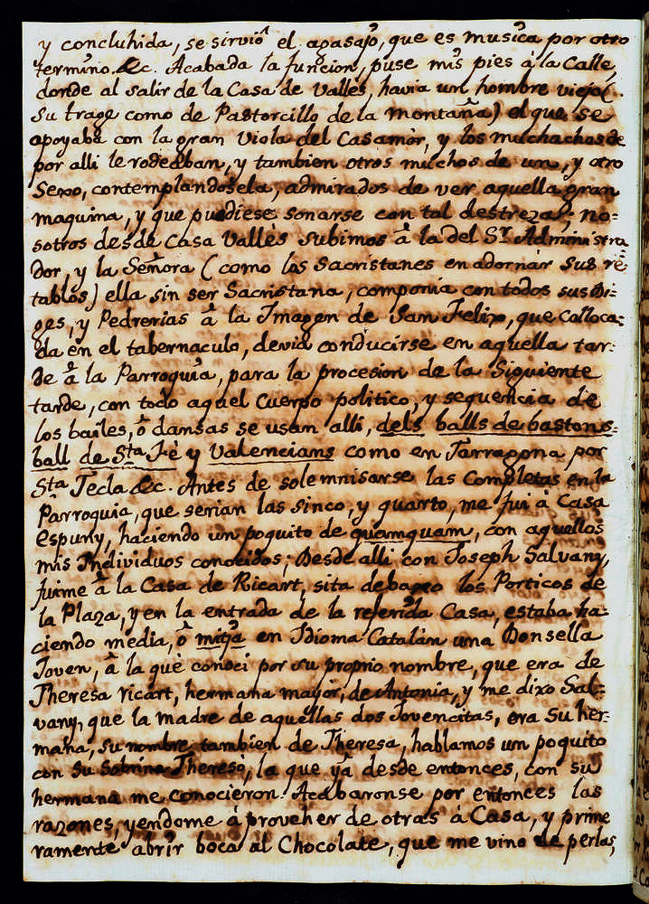 Detall del manuscrit Paseo á Villafranca del Panadés. Año de 1771 con el motivo de annual festividad, del Baró de Maldà, on es refereix al ball de valencians a Vilafranca del Penedès