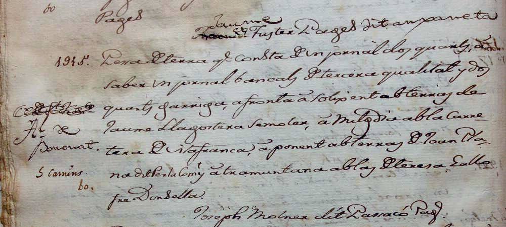 Fragment de la recanació realitzada entre 1816 i 1818 en què s’aprecia el propietari de la parcel·la 1945 i el renom. Es tracta de Jaume Fuster, pagès, dit Anxaneta