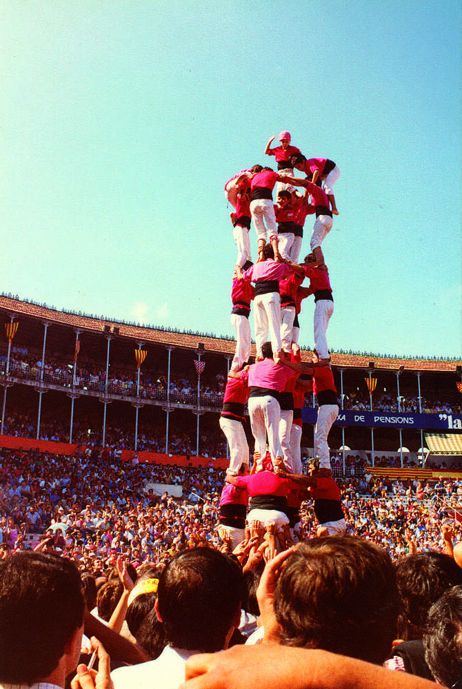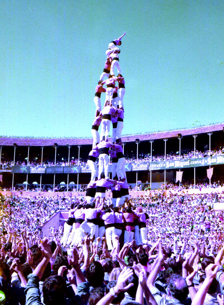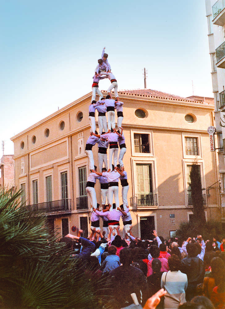 5 de 8 dels Castellers de Vilafranca del 1985, per Sant Fèlix: la colla de la capital de l'Alt Penedès superava el límit dels castells bàsics de vuit pisos.