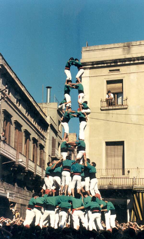 El primer intent de torre de 9 folre i manilles dels Castellers de Vilafranca, l'any 1989: els castells de gamma extra encara es resistirien uns anys.