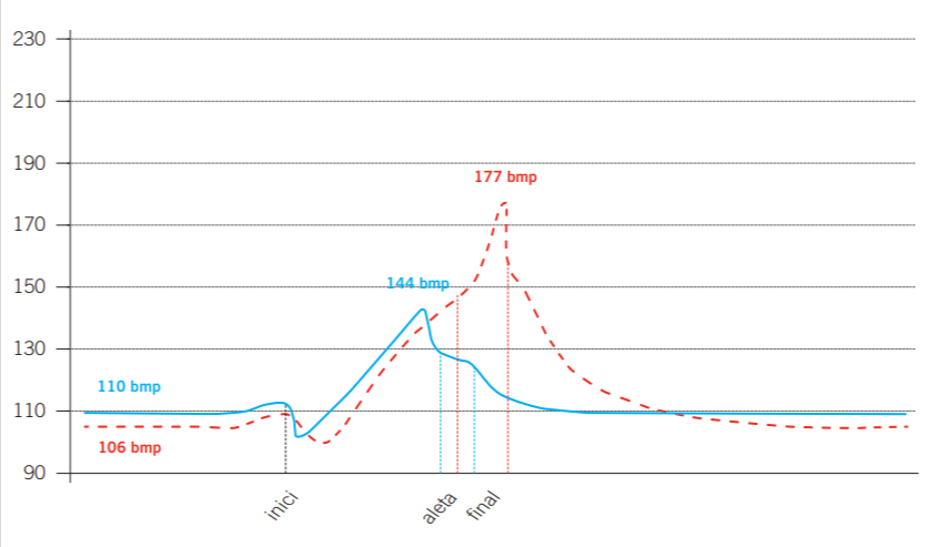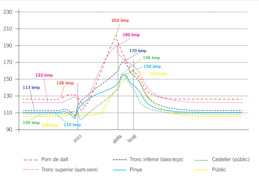 És interessant veure que, mentre que en els castells assequibles el màxim es produeix just abans de fer l’aleta, en els castells de màxima dificultat la freqüència cardíaca segueix augmentant fins que surten els segons. Molt possiblement aquí s’hi acaba barrejant la reacció a l’alegria d’haver aconseguit un castell de màxima dificultat.
