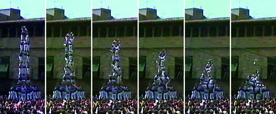 Caiguda d'un 3 de 9 amb folre en què es pot comprovar que, poc després de carregar-se el castell, el tronc es trenca i es col·lapsa l'estructura sobre si mateixa.