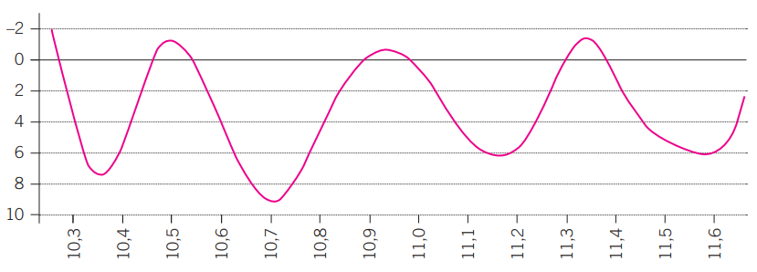 El gràfic 12 ens mostra el valor que va prenent l’acceleració en un enxaneta quan cau d’un 4 de 9 amb folre. Podem veure que, tret d’un moment puntual, té sempre valors inferiors a 9,8 m/s2. Encara més, en alguns moments és negativa. Això només es pot interpretar d’una manera: alguna cosa està frenant la caiguda d’aquest casteller de forma intermitent. I què pot fer-ho? Doncs només poden ser els companys amb els quals està agafat o que encara no han iniciat la caiguda, els que cauen més lentament que ell i els petits cops que es va donant durant el trajecte de caiguda contra altres castellers del tronc. Hem de destacar que aquestes dades estan preses durant una caiguda en què foren els membres del pom de dalt els que es van desequilibrar i caure. Però el fet que els sisens agafessin el peu dels dosos i no els deixessin anar, tot i que això va provocar l’arrossegament del tronc en la caiguda, va permetre frenar el descens del pom i va comportar que el castell s’ensorrés sobre ell mateix.