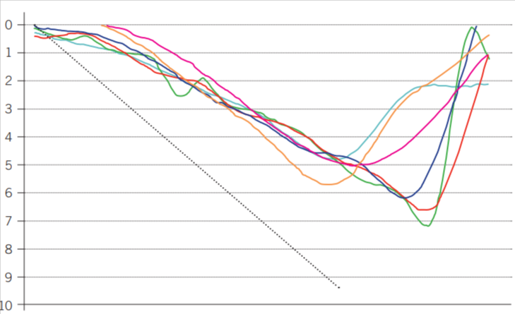 Gràfic 13. Valor de la velocitat, expressada en m/s, de diferents castellers durant la caiguda d’un 4 de 9 amb folre. Cada línia representa la velocitat d’un casteller. La línia puntejada negra indica la velocitat esperada si la caiguda fos lliure