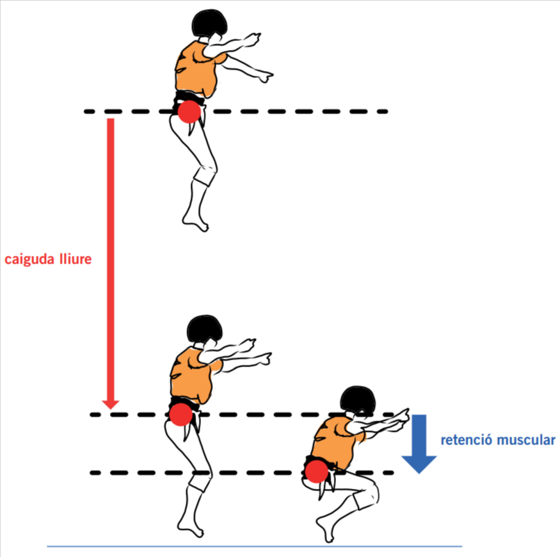 Ara bé, si caiem amb les cames estirades i rígides, el temps i la distància de desplaçament tornaran a ser mínims i no hi haurà atenuació de l’energia d’impacte. Així mateix, si caiem amb les cames flexionades però sense tensar-ne la musculatura, aquesta no retindrà energia ni allargarà el temps ni la distància d’aturada.