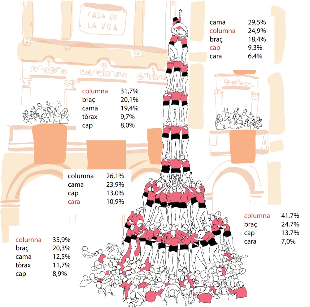 Si analitzem les parts del cos més afectades, per ordre de freqüència, en cada posició del castell, veiem que per a l’agulla, la crossa, el contrafort, el primer i segon vent, el segon lateral i el segones mans són la columna i el braç, mentre que en el cas del primeres mans i el primer lateral són el braç i la columna. Per a l’enxaneta i els dosos són la cama i la columna, mentre que en el cas de l’aixecador són la cama i el braç. En els sisens, els quints i el terços són la columna i la cama, mentre que en els quarts, segons i baixos són la columna i el braç.