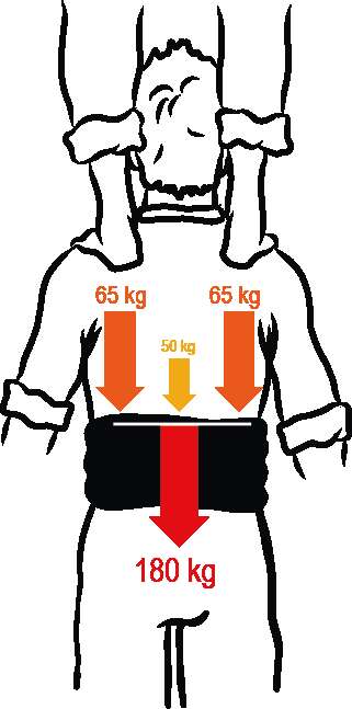 La figura 2 simula la repercussió que tindria en les lumbars la realització d’un pilar de quatre net que fos completament estàtic, sense desequilibris ni sotragades (fet que no existeix mai en la realització d’un castell, però que ens serveix com a punt de partida). El baix tindria uns 130 quilos de pes a sobre, simètricament distribuïts a cada espatlla (65 + 65), que es transmetrien a la part baixa de la columna. A aquest pes, hi caldria sumar els 50 quilos que pesa la part superior del seu propi cos, amb la qual cosa la zona lumbar hauria de suportar finalment un total de 180 quilos.
