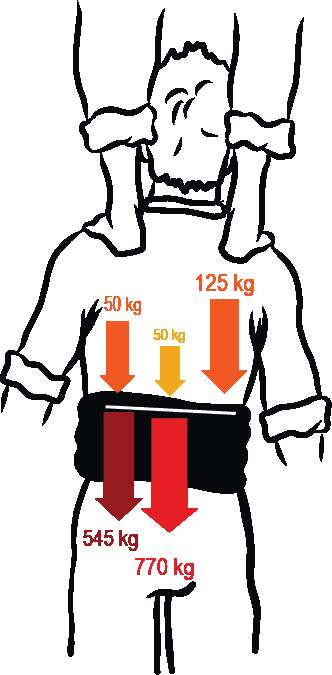 Figura 2. Si el pilar de 4 net estigués perfectament equilibrat i no es produís cap pic de càrrega, el pes total que hauria de suportar la columna lumbar del baix seria de 180 quilos (Roset 2000a: 26-28).