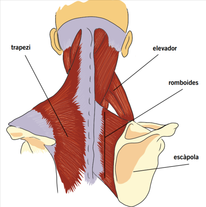 Figura 1. El pes que arriba al casteller per les espatlles és transmès a la columna cervical i dorsal mitjançant els músculs elevadors de l'escàpola, els romboides i el trapezi (Roset 2000: 23-25).