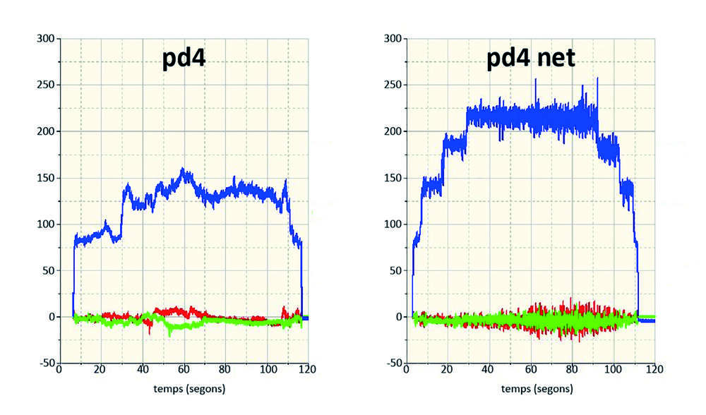 Gràfic 1. Es mostren les magnituds de les càrregues (expressades en quilos) durant la realització d’un pilar de 4 i un pilar de 4 net. Es desglossen les càrregues en els tres eixos (Fz —en blau— representa la càrrega vertical, Fx —en vermell— expressa la càrrega que es desplaça endavant o endarrere, i Fy —en verd— correspon als desplaçaments de pes a dreta i esquerra del casteller).
