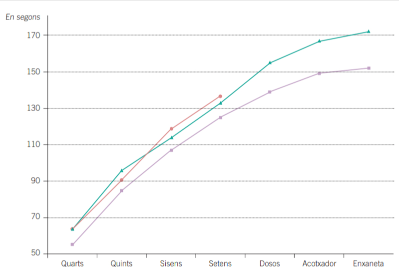 Gràfic 2. Temps de muntatge, des de l’entrada dels quarts fins a l’aleta (o la caiguda), del 3 de 10 amb folre i manilles dels Minyons de Terrassa (en malva), els Castellers de Vilafranca (en verd) i la Colla Vella dels Xiquets de Valls (en rosat) durant l’actuació de Sant Fèlix del 2015