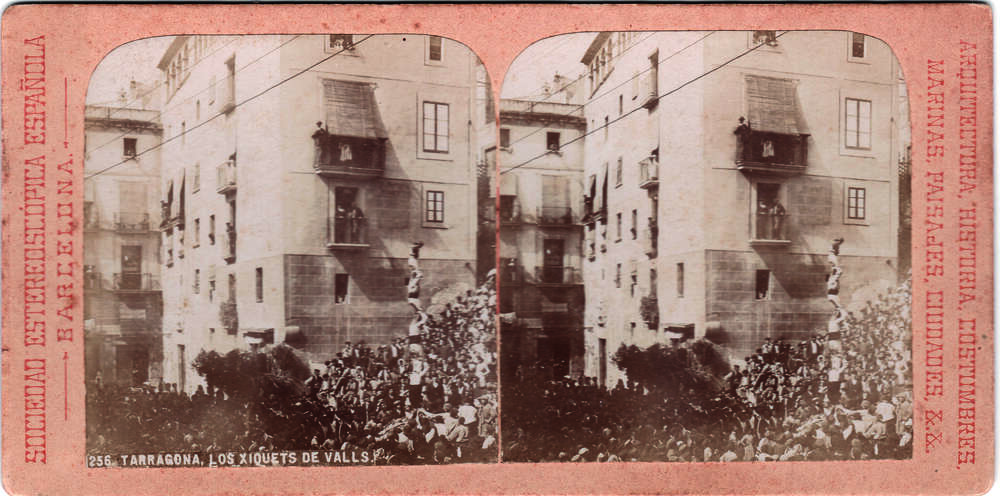 Pilar de cinc pujant les escales de la Catedral de Tarragona el dia de la Mercè, probablement de finals del segle XIX o inicis del segle XX. Fotografia editada per la Sociedad Estereoscópica Española de Barcelona, dins de la sèrie «Arquitectura, Historia, Costumbres, Marinas, Paisajes, Ciudades», amb el núm. 255 («Xiquets de Valls»).