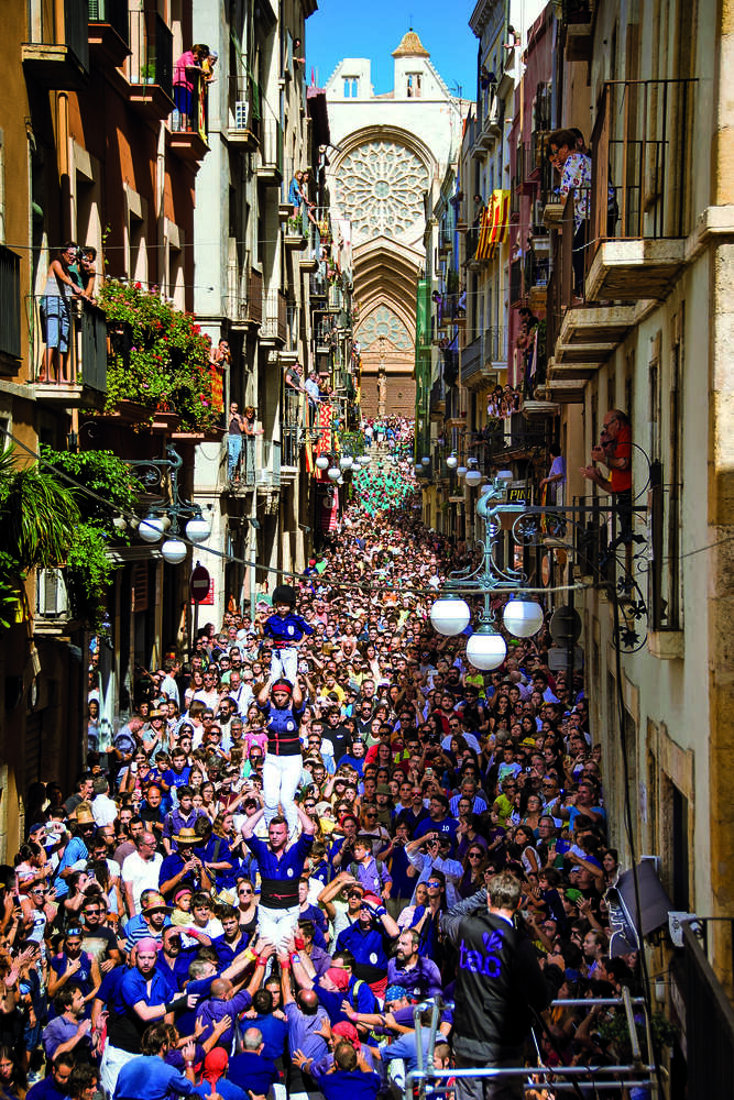 El pilar de quatre caminant dels Xiquets del Serrallo avança pel carrer Major de Tarragona, camí de l'Ajuntament.