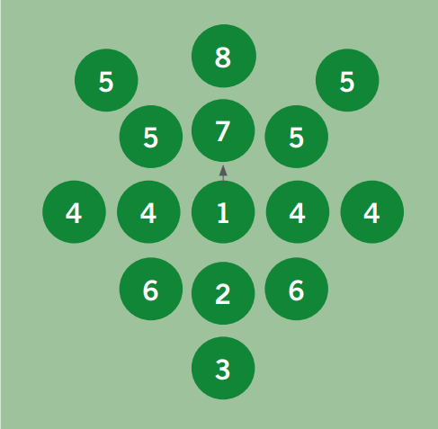 Esquema dels components de la pinya del pilar caminant de Tarragona. S'observa que no hi ha crosses ni home del darrere. 1: baix; 2: primeres mans; 3: segones mans; 4: laterals (o daus); 5: mans dels genolls (o laterals); 6: falques; 7: home del davant; 8: segon home del davant.