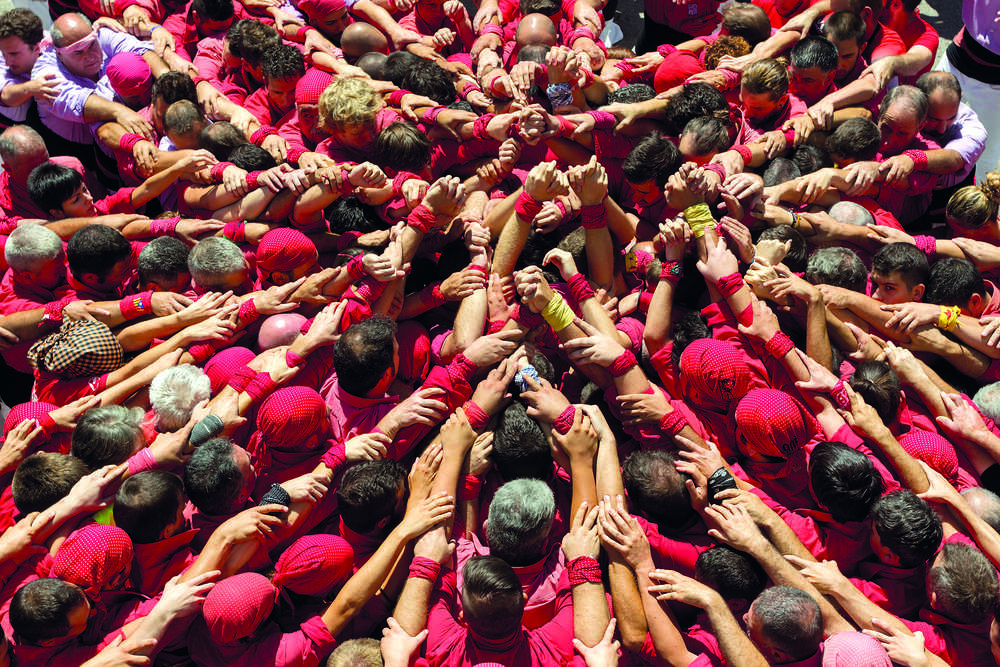 Entramat de braços a la pinya d'un castell dels Nens del Vendrell.