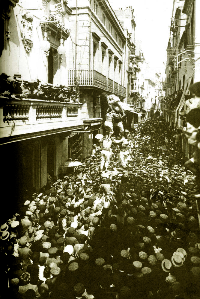 3 de 6 a Vilafranca del Penedès durant el període de la Decadència, a la segona dècada del segle XX. Es pot observar que part del públic i algunes autoritats del balcó aplaudeixen la consecució del castell.