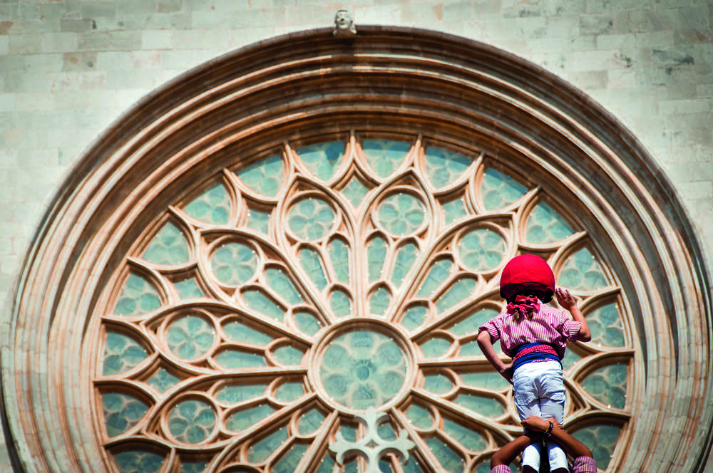 L'enxaneta d'un pilar dels Xiquets de Tarragona, davant de la rosassa de la catedral.