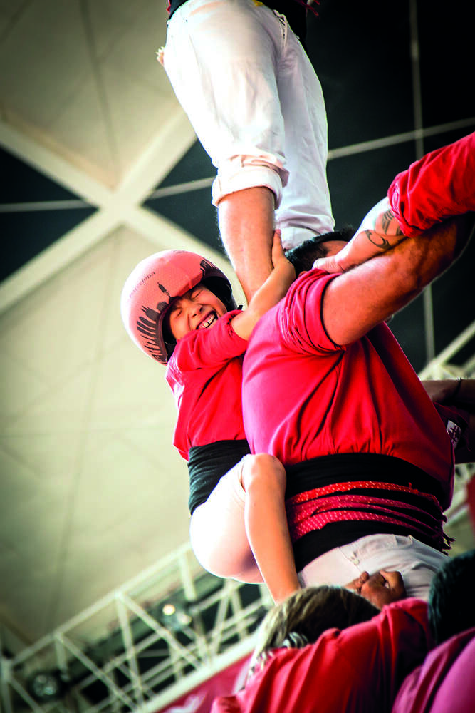 L'enxaneta dels Nens del Vendrell s'encavalca damunt d'un dels aixecadors del 5, i fa l'aleta.