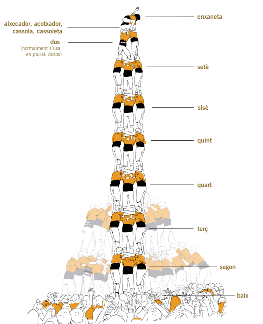 – els dososLa seva funció principal és tancar el castell per dalt. Quan finalitza el tronc, la construcció va ad­quirint una progressiva forma piramidal, que culminen l’aixecador i l’enxaneta.