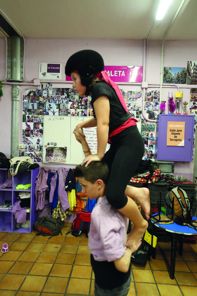Foto 8: la castellera es recolza amb els braços a les espatlles del casteller de sota i treu el genoll dret de l’espatlla dreta del casteller de sota, que alhora estén els braços.