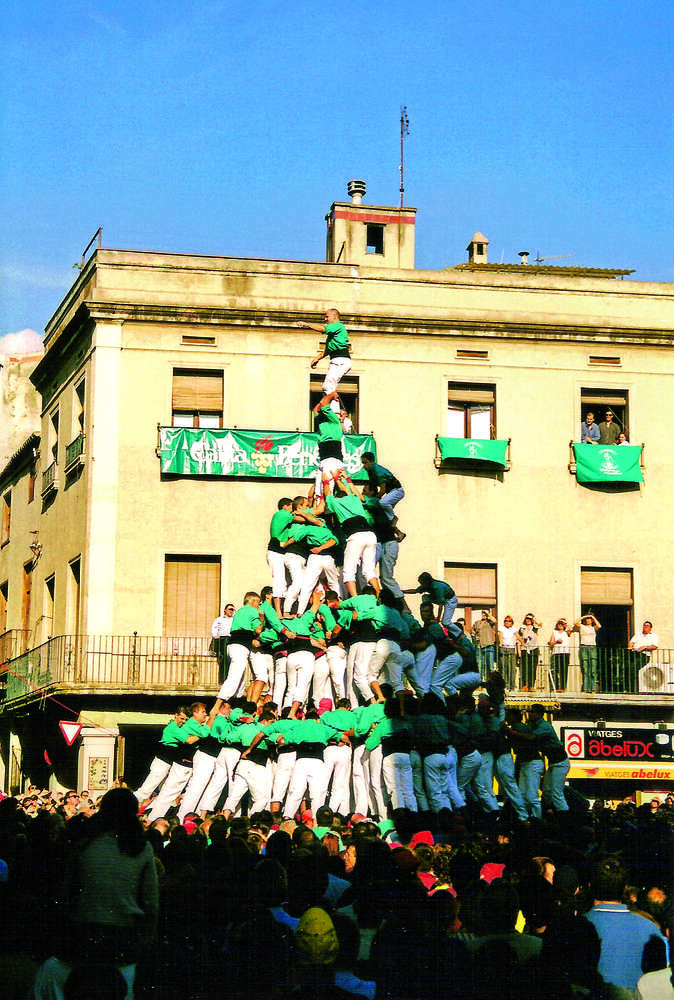 Intent de pilar de 9 amb folre, manilles i puntals dels Castellers de Vilafranca, per la diada de Tots Sants del 2002.