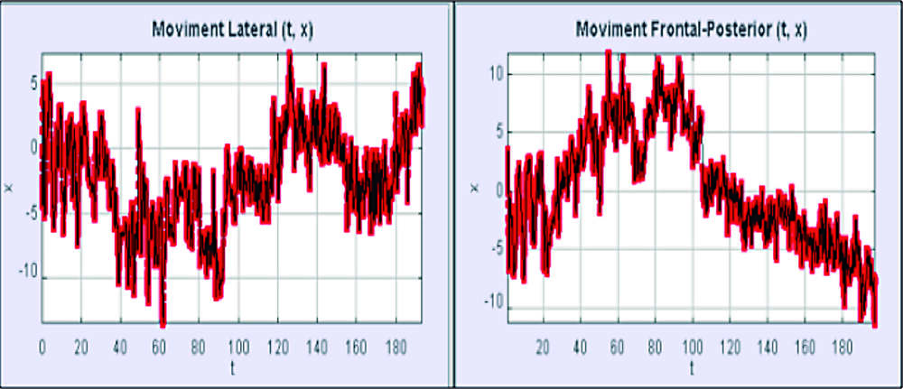 Exemple de gràfiques elaborades amb la tecnologia de captació de moviment. La imatge plasma les pautes de comportament d'un segon de la rengla de baixada de l'enxaneta d'un 2 de 8 sense folre, en cm (x) i segons (t). Els nombres positius són els moviments cap a la dreta i/o al davant, i els negatius, a l'esquerra i/o endarrere.